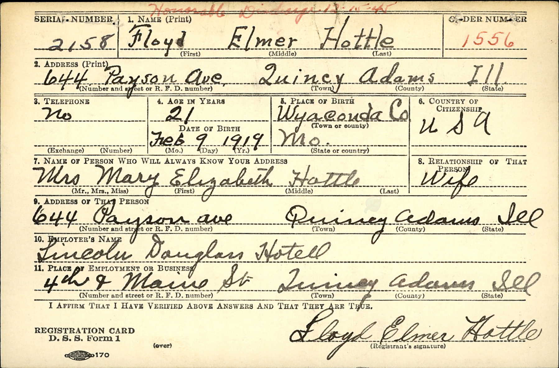 WWII REGRISTRATION CARD D. S. S. Form 1 29 Oct 1940