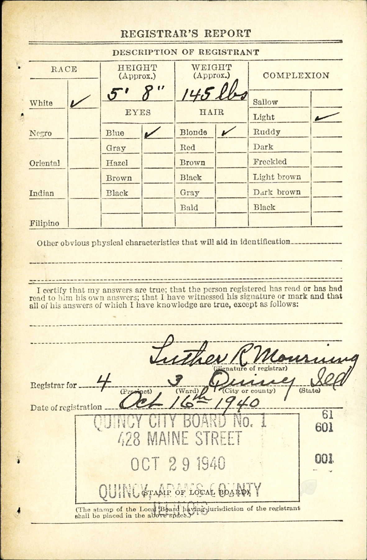 WWII REGRISTRATION CARD D. S. S. Form 1 29 Oct 1940 back