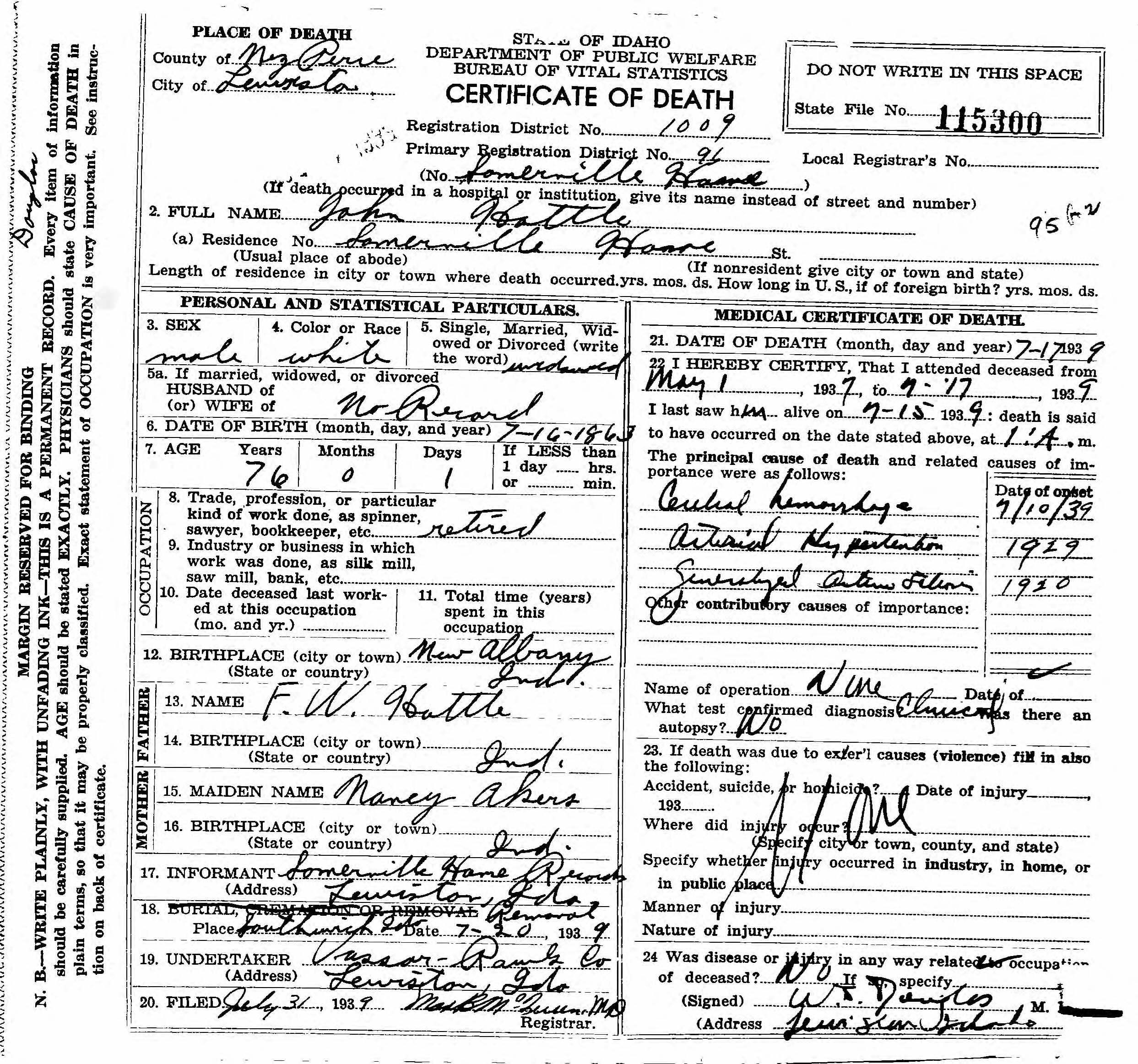 JOHN HOTTLE death certificate 1939
