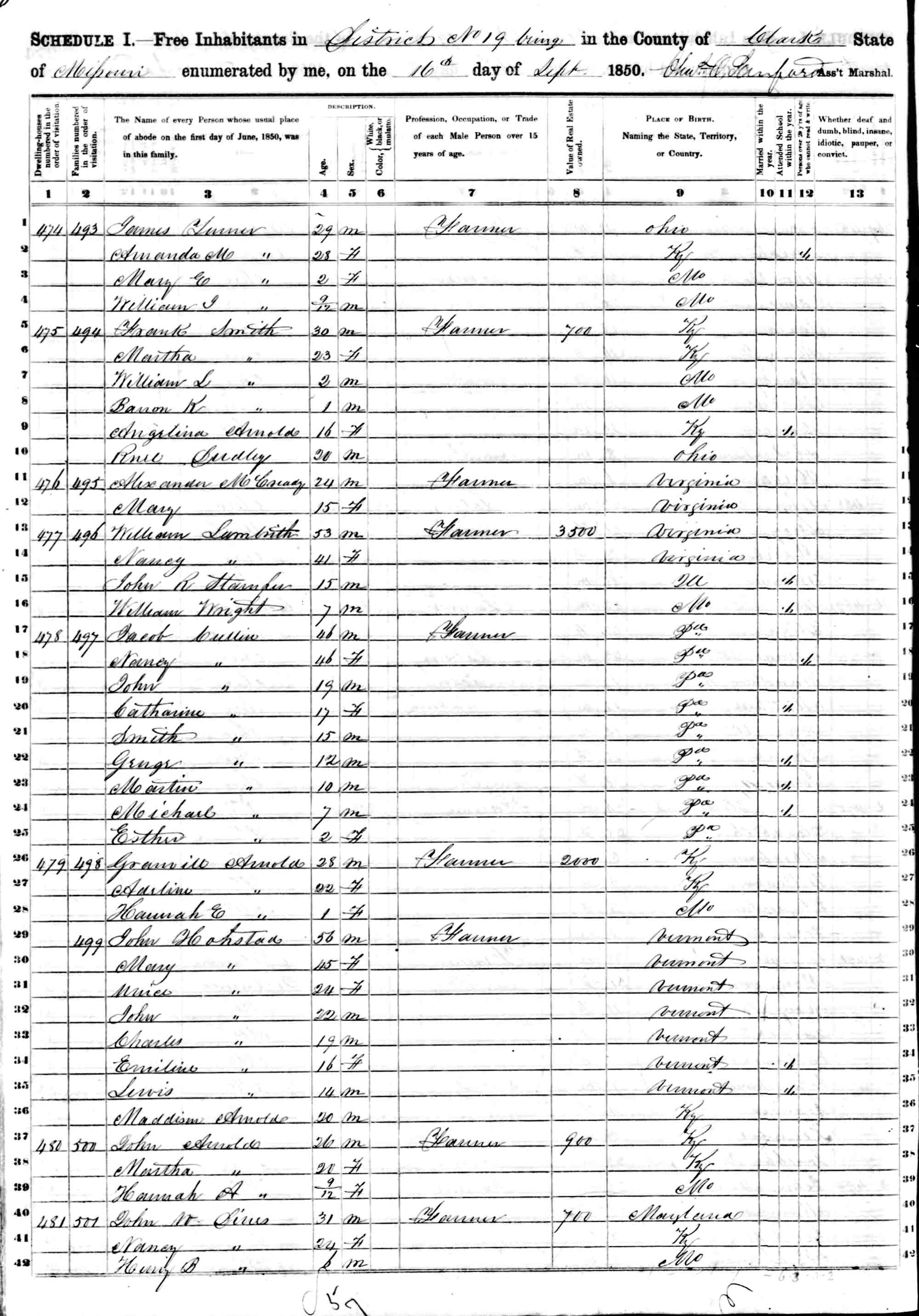 !850 US Census, District 19 [Washington Township,] Clark County, Missouri