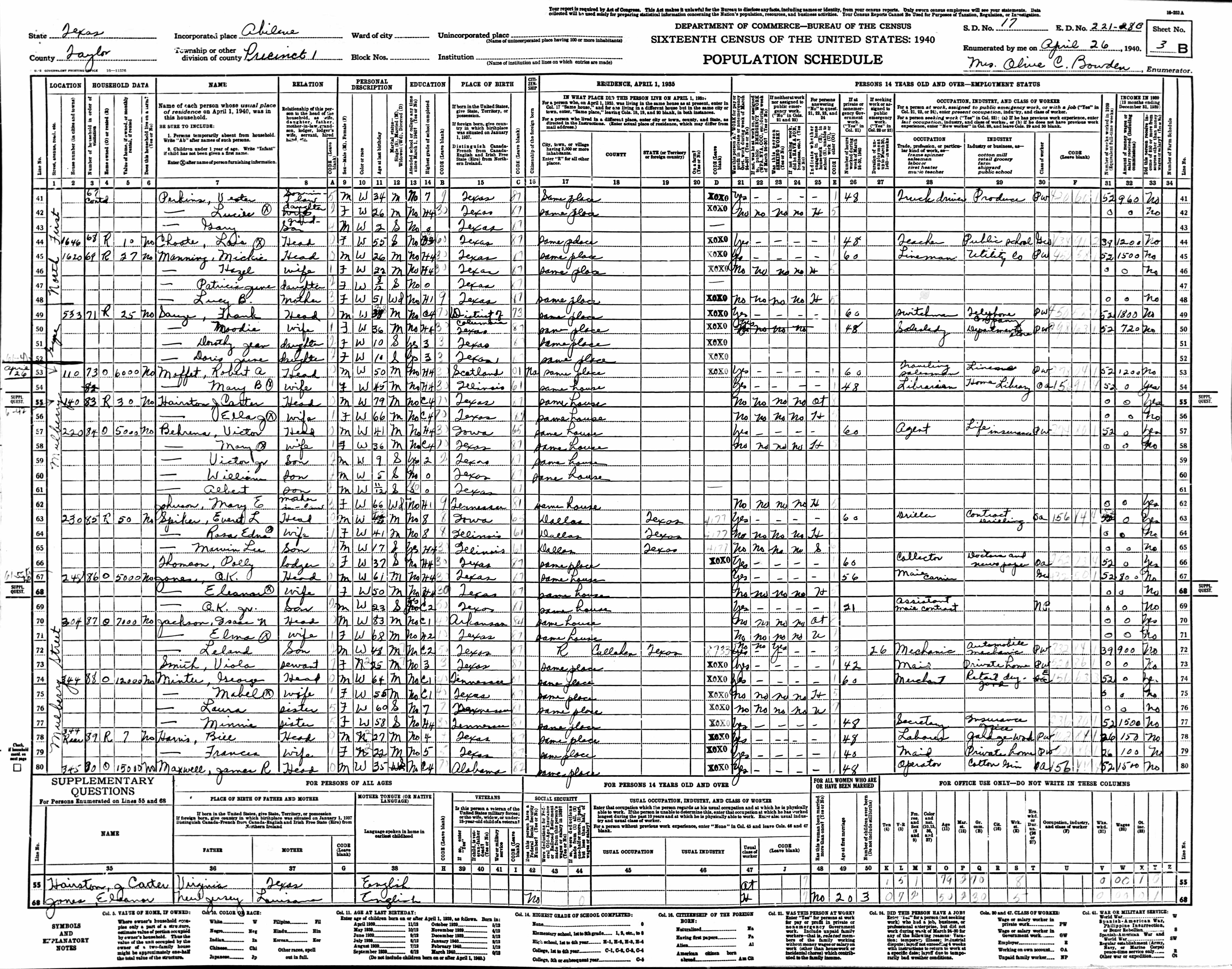 1940 US Census for Victor Emanuel Behrens family