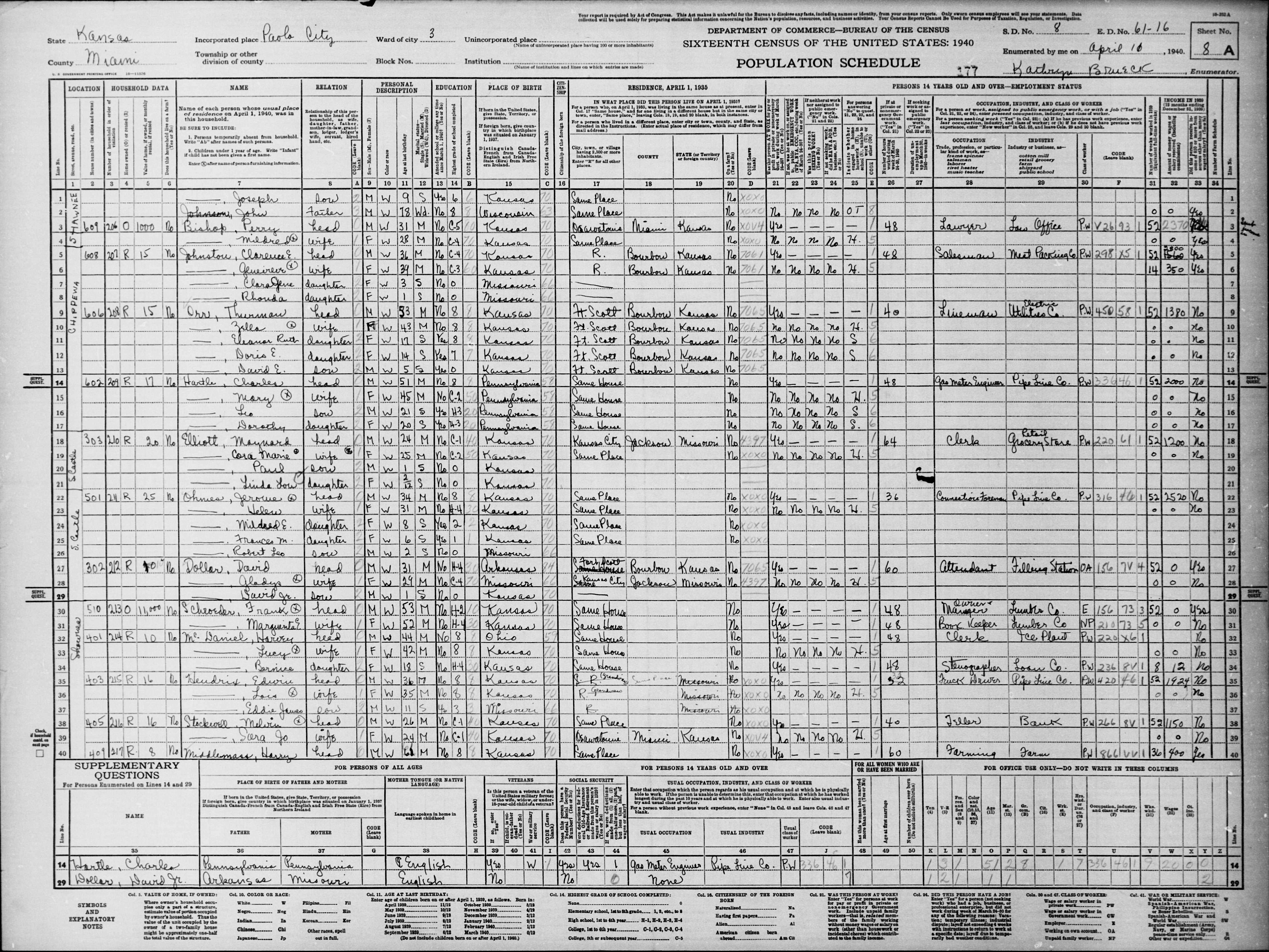 US Census 1940 Kansas, Miami, Paola
