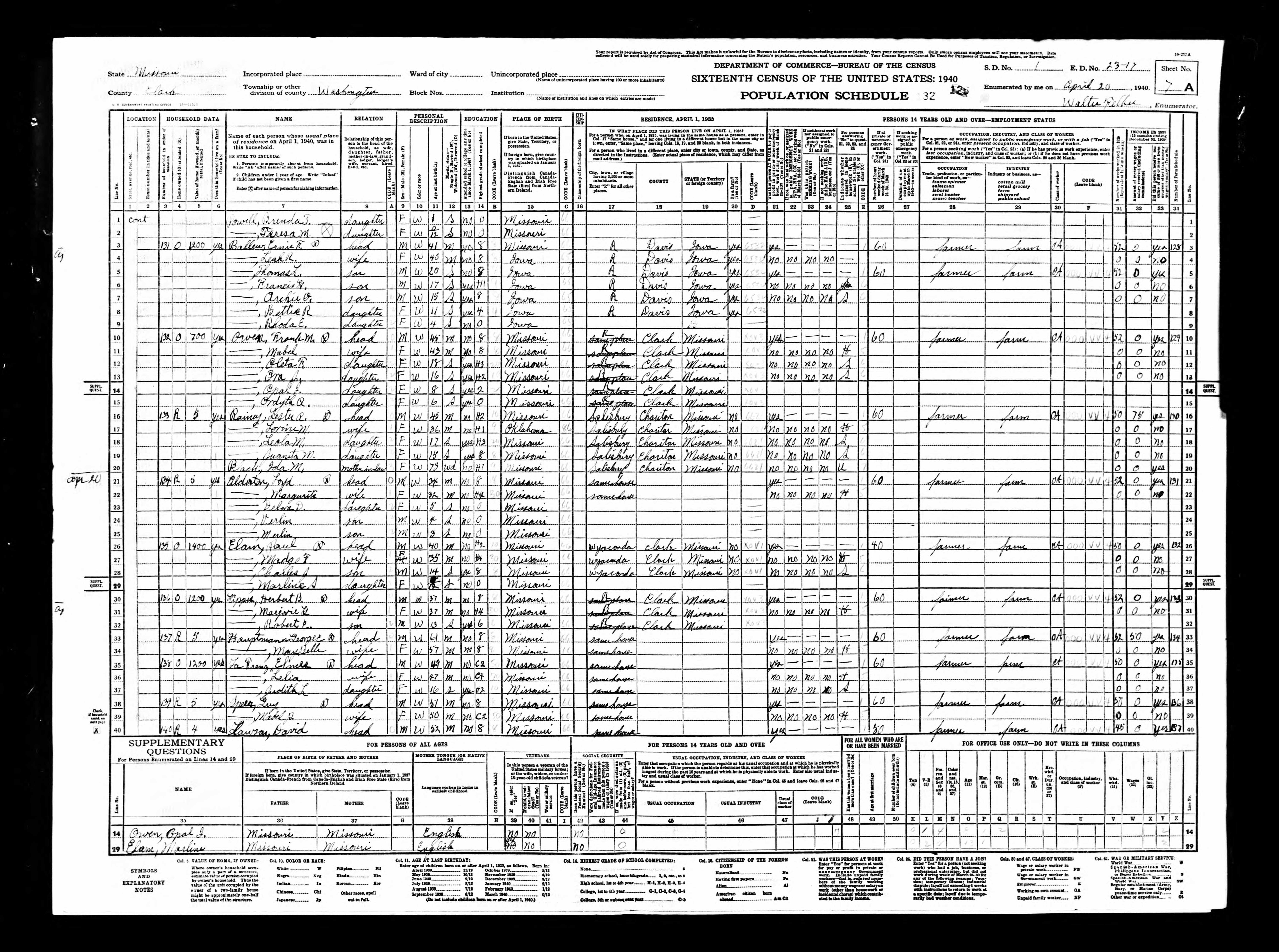 1940 US Census, State of Missouri, County of Clark, Township of Washington