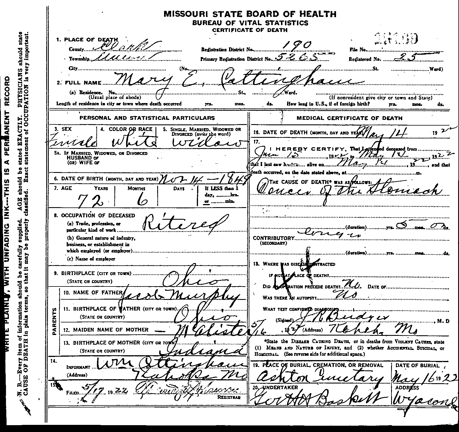 Missouri Death Certificate for